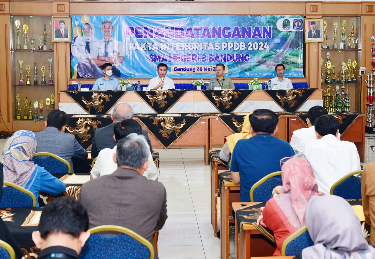 Pakta integritas ini ditandatangani oleh operator PPDB, ketua dan wakil ketua komite, kepala sekolah, wakil kepala sekolah, juga Plh Kepala Dinas Pendidikan Jabar Ade Afriandi di aula SMA Negeri 8 Kota Bandung, Selasa (28/5/2024).