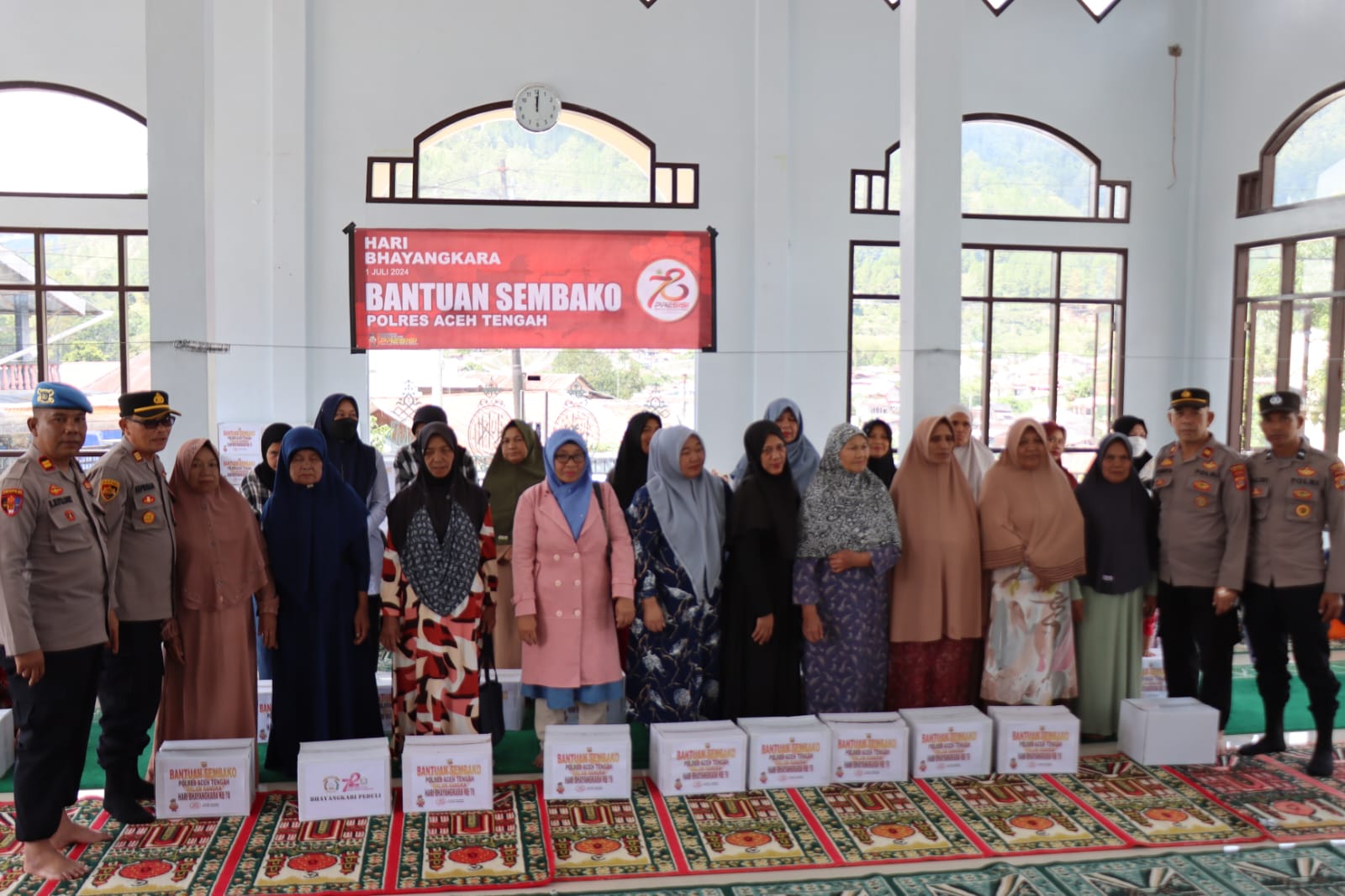 Dalam menyambut Rangkaian Hut Bhayangkara Ke-78 Polres Aceh Tengah, menyiapkan 500 paket sembako untuk diberikan kepada, fakir miskin, petani, petugas kebersihan, pemulung, warakauri dan warga lainnya yang membutuhkan serta warga kurang mampu, dengan mendatangi warga masyarakat hingga ke pelosok desa di Kecamatan-kecamatan Kabupaten di Aceh Tengah.