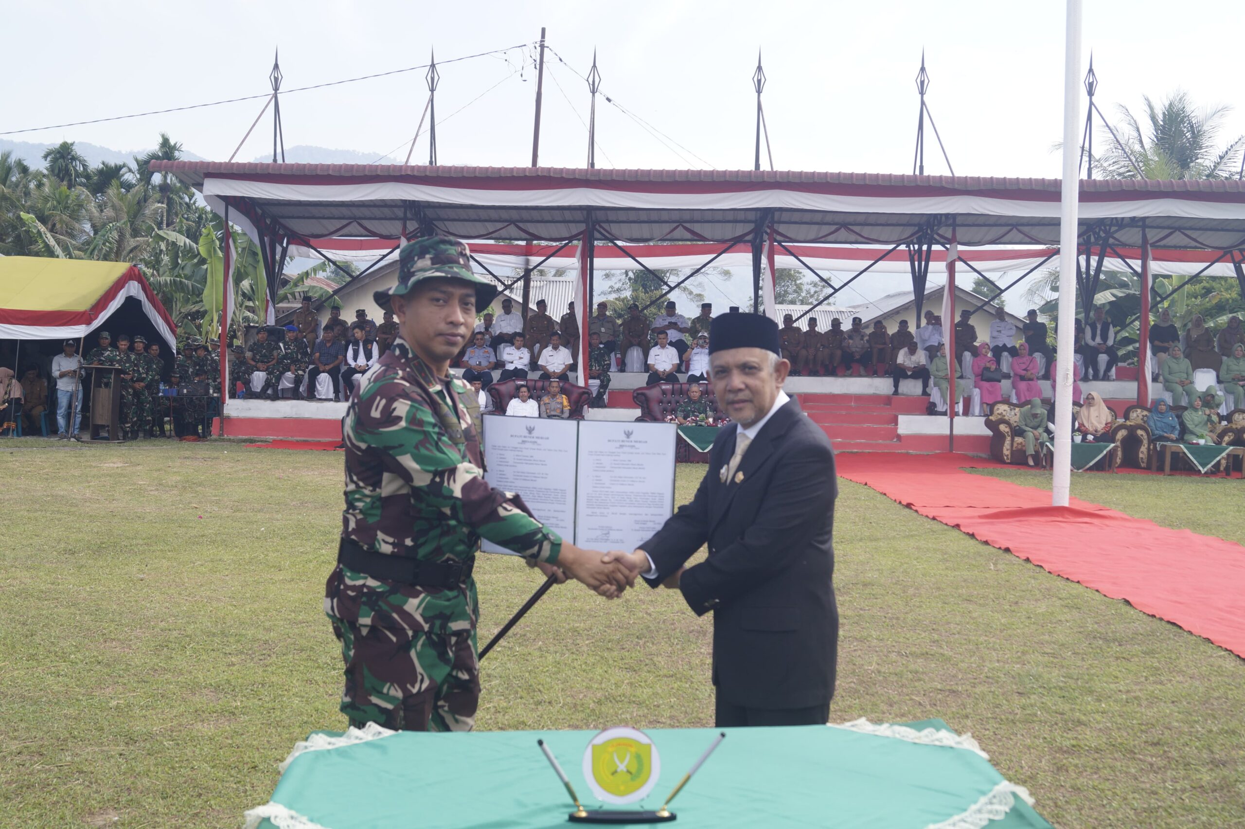 Sebelum membacakan amanatnya Pj Bupati bersama Dansatgas TMMD Letkol Kav Ino Dwi Setyo Darmawan, S.E., M.Han., menandatangani naskah serah terima TMMD Reguler ke 121.