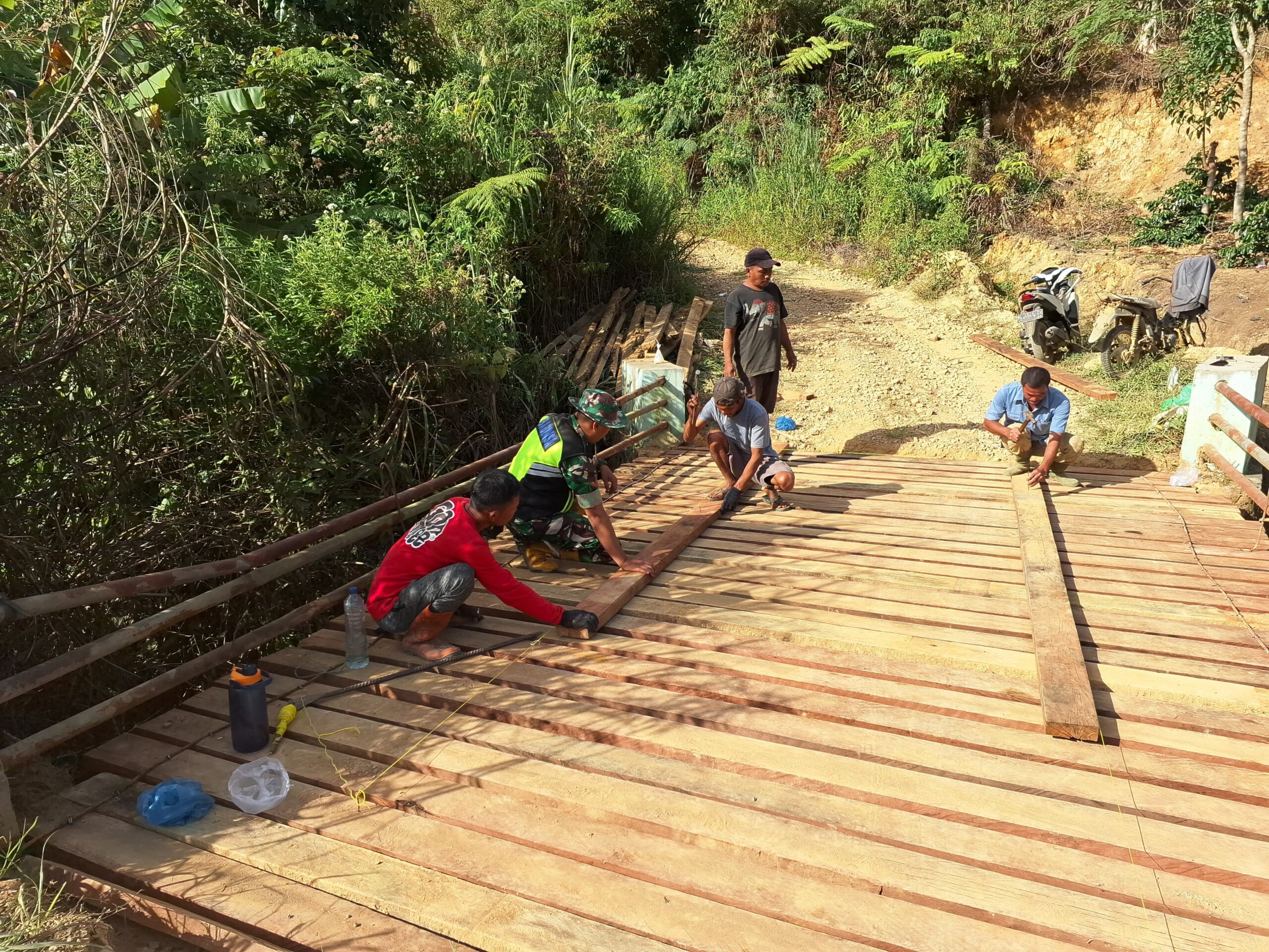 Oleh karena itu Babinsa Koramil 03/Pegasing Kopda Frennando Saragih bersama Masyarakat Memperbaiki Jembatan di dusun Kala Wih Ilang Desa Wih ilang Kec.Pegasing Kab.Aceh Tengah. Rabu (31/07/24)