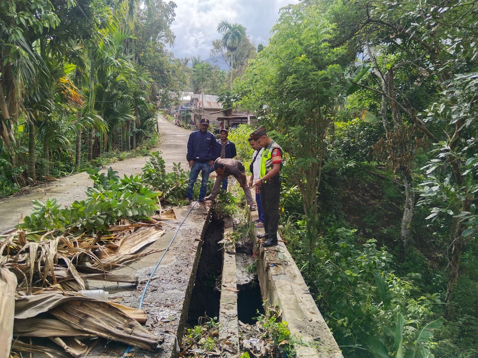 Sejumlah warga beserta aparatur desa bersama Babinsa Koramil 03/Timang Gajah melakukan pengecekan tanah yang longsor dan terputusnya saluran air bersih tersebut akibat hujan deras yang melanda Desa Alam Jaya, Kecamatan Gajah Putih.