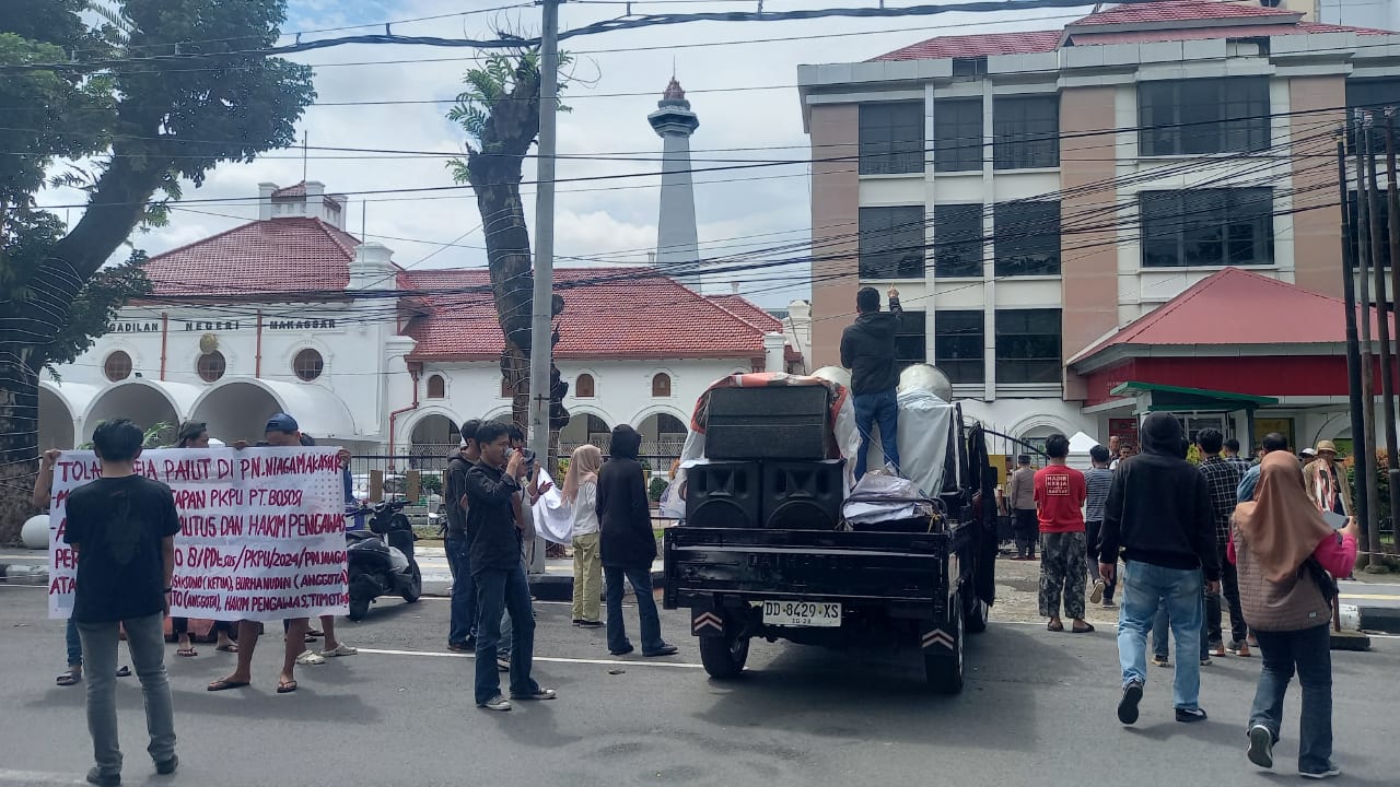 Aksi Unjuk rasa yang dilakukan oleh Massa dari Rumah Pegiat Hukum dan Demokrasi didepan PN Makassar dengan Issue Tolak penetapan PKPU Sementara No.8/Pdt.Sus-PKPU/2024/PN Niaga Makassar pada Tanggal 17 Oktober 2024 yang mana keputusan tersebut dinilai cacat prosedur dalam proses penetapannya. Senin 16/12/2024.
