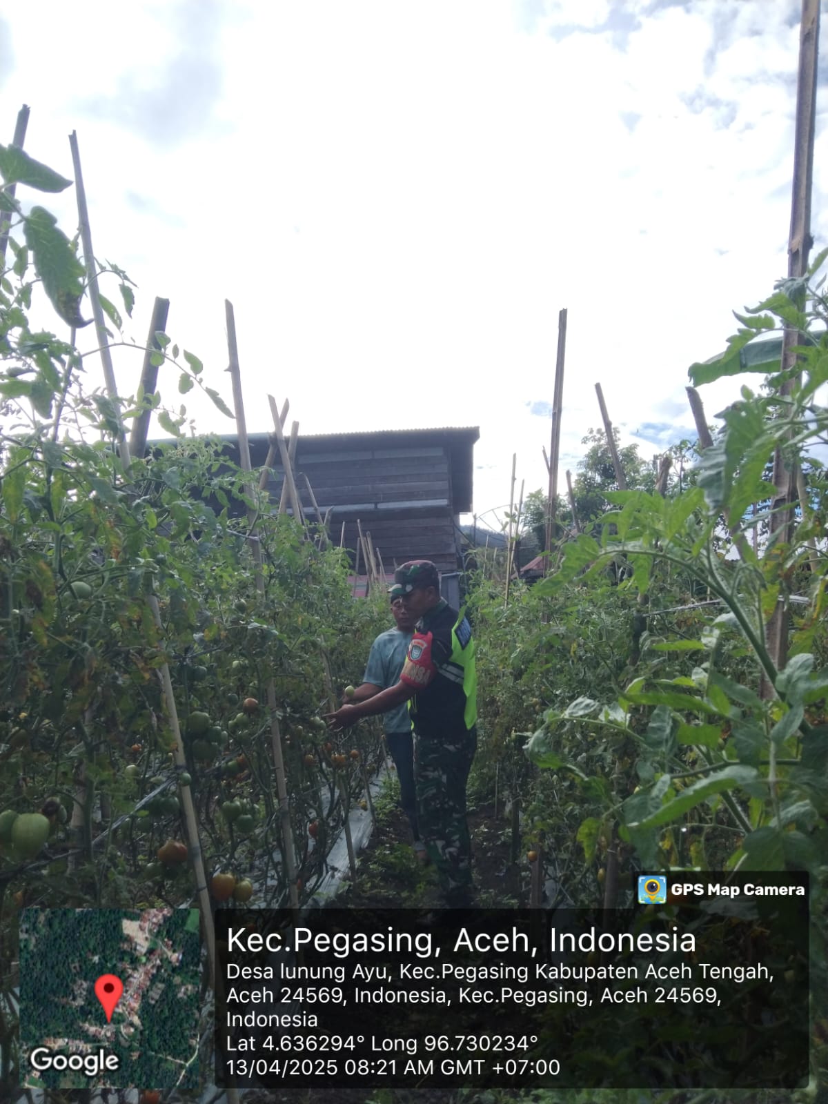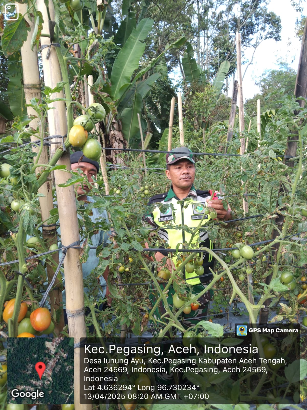 Babinsa Koramil 03/pegasing kodim 0106 Aceh Tengah. Serda Suryadi membantu masyarakat mengutip tomat milik bapak zunaidi Didesa linung Ayu Kecamatan pegasing Kabupaten Aceh Tengah. Senin 14/04/2025.
