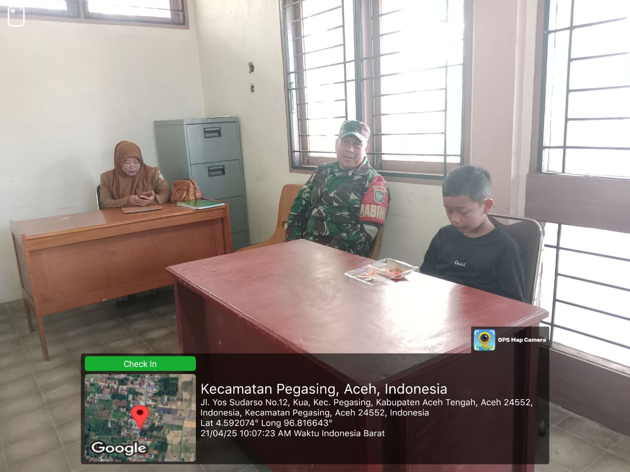 Kodim 0106/AcehTengah. Babinsa Koramil 03/Pegasing Serda Adi Rahmanto Melaksanakan komsos bersama staf kantor camat Pegasing kabupaten Aceh Tengah. Selasa 22/04/2025.