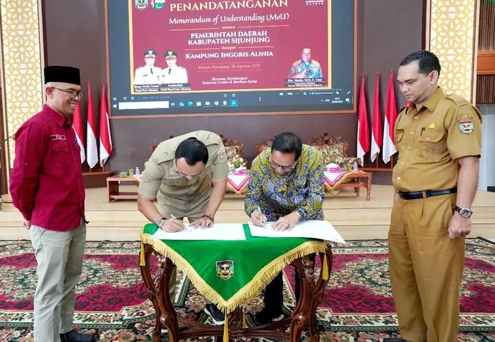 Sijunjung – medianasionaljurnlais.com Pemerintah Daerah Kabupaten Sijunjung melalukan penandatanganan Momerandum Of Understanding (MoU) dengan Kampung Inggris Alinia bertempat di Balairung Lansek Manih, Kantor Bupati setempat pada Selasa 26 Agustus 2025.