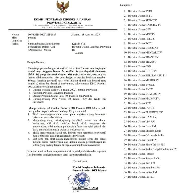 Komisi Penyiaran Indonesia Daerah (KPID) Provinsi DKI Jakarta menerbitkan surat edaran bernomor 309/KPID-DKI/VIII/2025 tertanggal 28 Agustus 2025 yang ditujukan kepada seluruh direktur utama lembaga penyiaran di Jakarta. Surat tersebut berisi imbauan agar lembaga penyiaran tidak menayangkan siaran atau liputan unjuk rasa yang dinilai berpotensi “memprovokasi” atau menimbulkan keresahan publik.