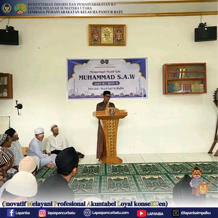 Lembaga Pemasyarakatan (Lapas) Kelas IIA Pancur Batu menggelar peringatan Maulid Nabi Muhammad SAW 1447 Hijriah dengan penuh khidmat. Acara yang diisi oleh Penceramah Ustad Habib Said Al Hafidz ini dan dihadiri oleh seluruh warga binaan, petugas Lapas Pancur Batu di Masjid At-Taubah Lapas Pancur Batu, Jumat (12/9/2025).