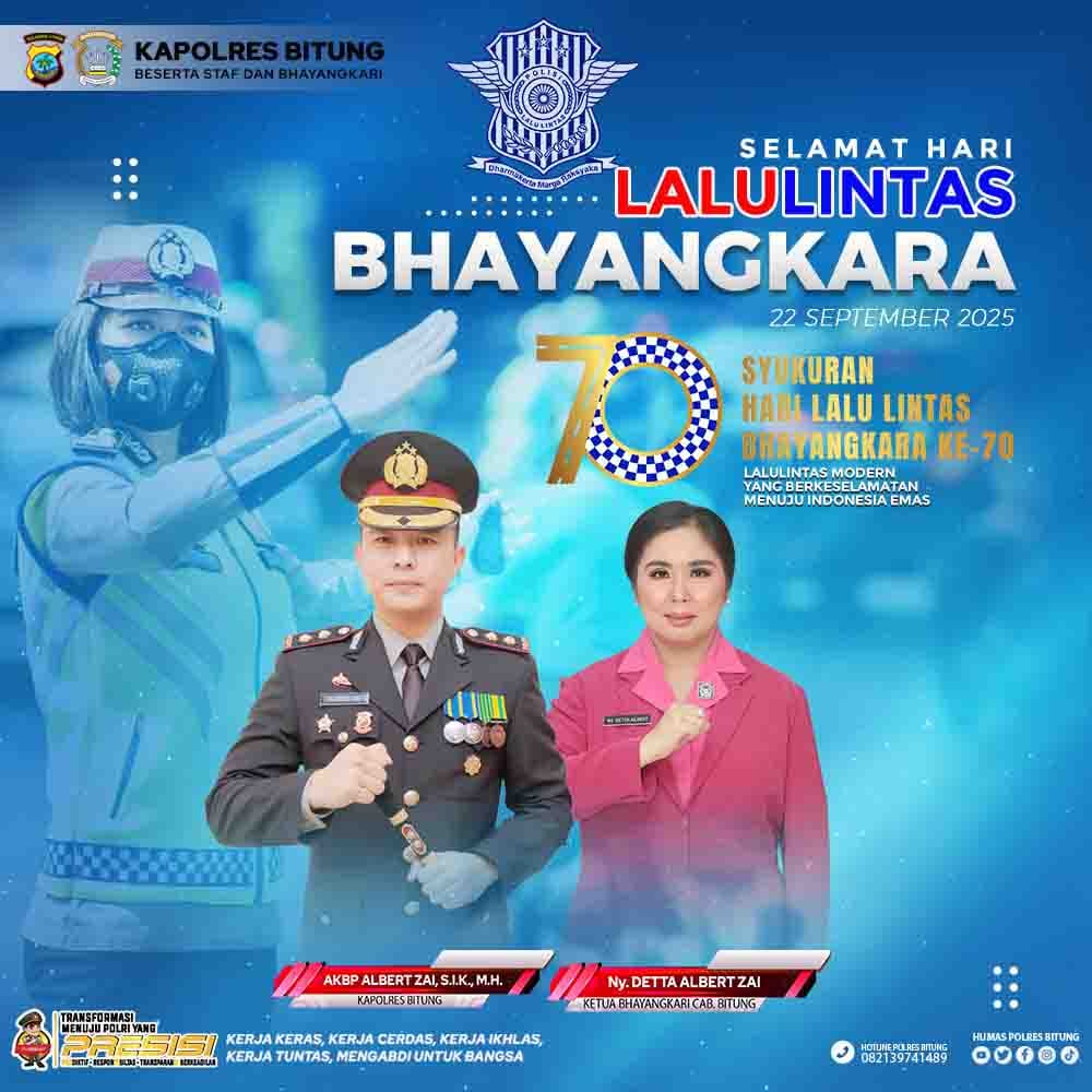 Bitung – Dalam rangka memperingati Hari Lalu Lintas Bhayangkara ke-70 yang jatuh pada 22 September 2025, Kapolres Bitung AKBP Albert Zai, SIK., MH bersama jajaran staf dan Bhayangkari menyampaikan ucapan selamat sekaligus apresiasi kepada seluruh personel lalu lintas.