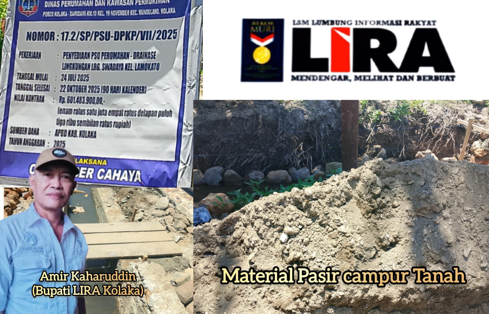 nasionaljurnalis.com,Kolaka – DPD LSM LIRA Kolaka mendesak Pejabat Pembuat Komitmen (PPK) yang juga Kepala Dinas Perumahan dan Kawasan Permukiman Kabupaten Kolaka untuk segera menghentikan sementara proyek drainase di Jalan Swadaya, Kelurahan Lamokato. Proyek dengan anggaran sekitar Rp 600 juta itu diduga dikerjakan dengan material tidak sesuai spesifikasi teknis, terutama penggunaan pasir bercampur tanah.