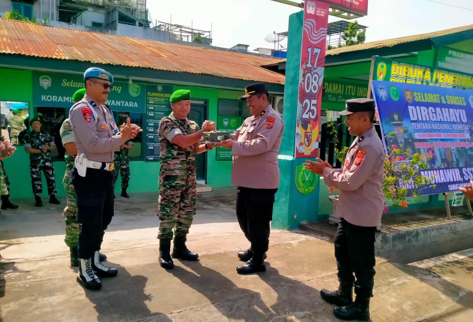 Iptu Muhammad Suherno secara langsung menyerahkan kue ulang tahun tersebut kepada Danramil 03/Dwt, Lettu Czi Jamidin, sebagai bentuk ucapan selamat Hari Ulang Tahun (HUT) TNI ke-80. Momen ini menjadi wujud nyata kekompakan dan keharmonisan antara kedua institusi dalam menjaga keamanan dan ketertiban masyarakat.