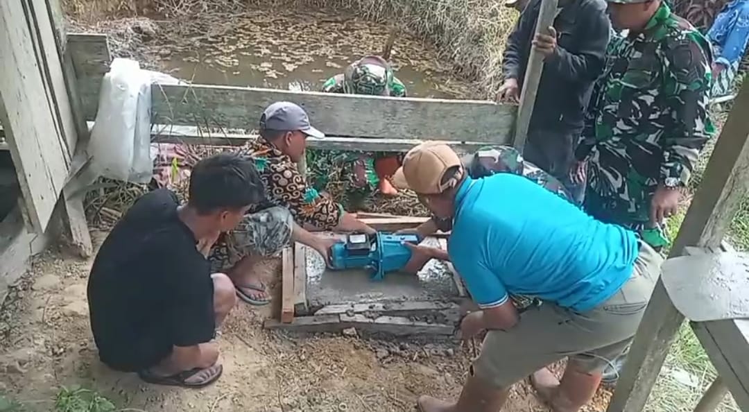 Pada hari ini, pelaksanaan pekerjaan difokuskan pada pembuatan cor beton dudukan mesin penyedot air, yang dikerjakan secara gotong royong oleh personel TNI bersama masyarakat setempat.