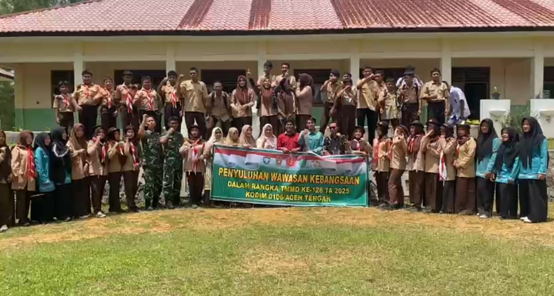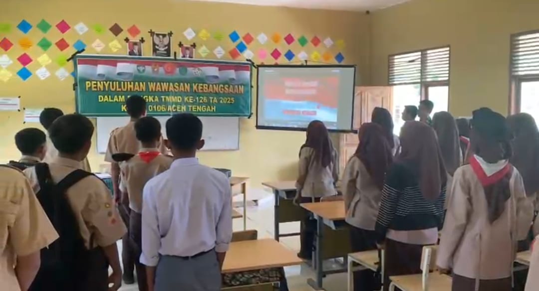 Dalam rangka menumbuhkan semangat cinta tanah air di kalangan pelajar, Satgas TNI Manunggal Membangun Desa (TMMD) ke-126 Kodim 0106/Aceh Tengah melaksanakan kegiatan Penyuluhan Bela Negara dan Wawasan Kebangsaan di SMAN 18 Takengon, Kabupaten Aceh Tengah, Jumat (10/10/2025).