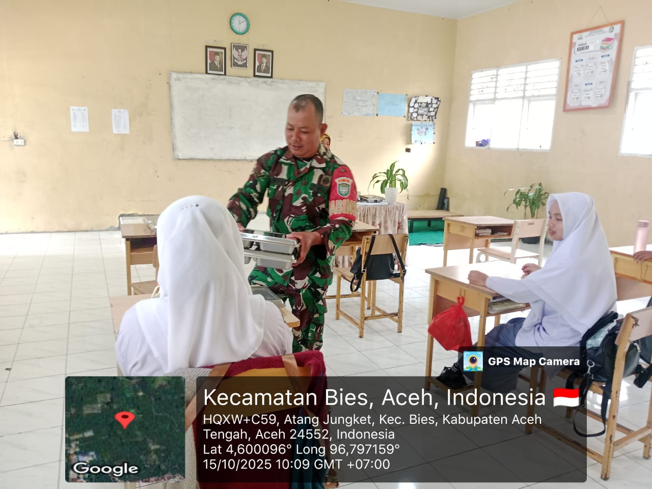 Pada Rabu, 15 Oktober 2025, Anggota Koramil 03/Pegasing, Serda Sukarsono, melaksanakan kegiatan pendampingan serta pembagian makanan bergizi kepada para siswa SMA Negeri 17 Aceh Tengah, yang berlokasi di Kecamatan Bies, Kabupaten Aceh Tengah.