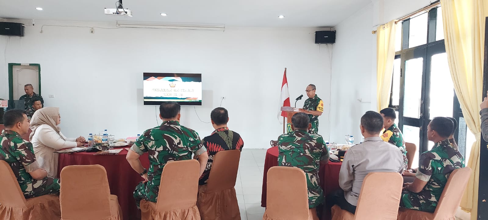 Komandan Kodim 0106/Aceh Tengah Letkol Inf Raden Herman Sasmita menerima kedatangan Tim Pengawasan dan Evaluasi (Wasev) Staf PJO TMMD Ke-126 TA 2025 di Aula Makodim 0106/Aceh Tengah, Jalan Sengeda, Kampung Bale Atu, Kecamatan Lut Tawar, Kabupaten Aceh Tengah, Sabtu (18/10/2025).
