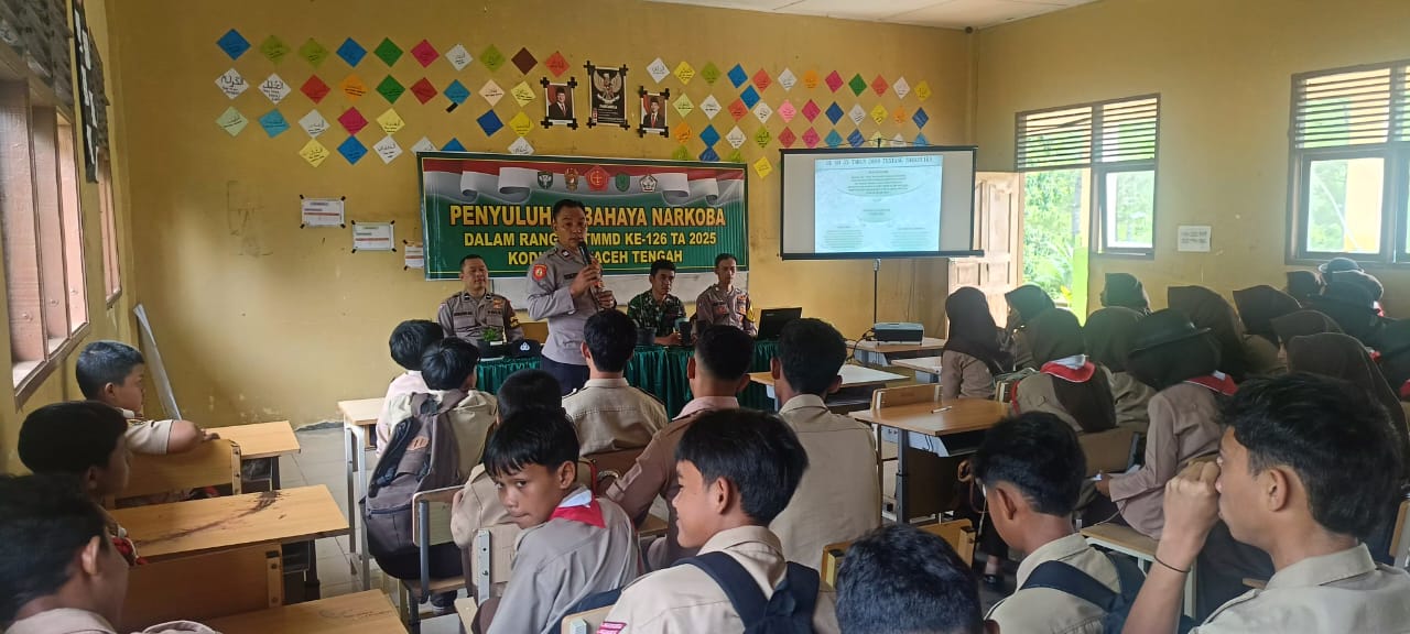 Dalam rangka kegiatan sasaran non fisik TNI Manunggal Membangun Desa (TMMD) ke-126 Tahun Anggaran 2025, Satgas TMMD Kodim 0106/Aceh Tengah bekerja sama dengan Polsek Linge menggelar penyuluhan bahaya narkoba dan hukum kamtibmas di Aula SMAN 18 Takengon, Kecamatan Linge, Sabtu (18/10/2025).