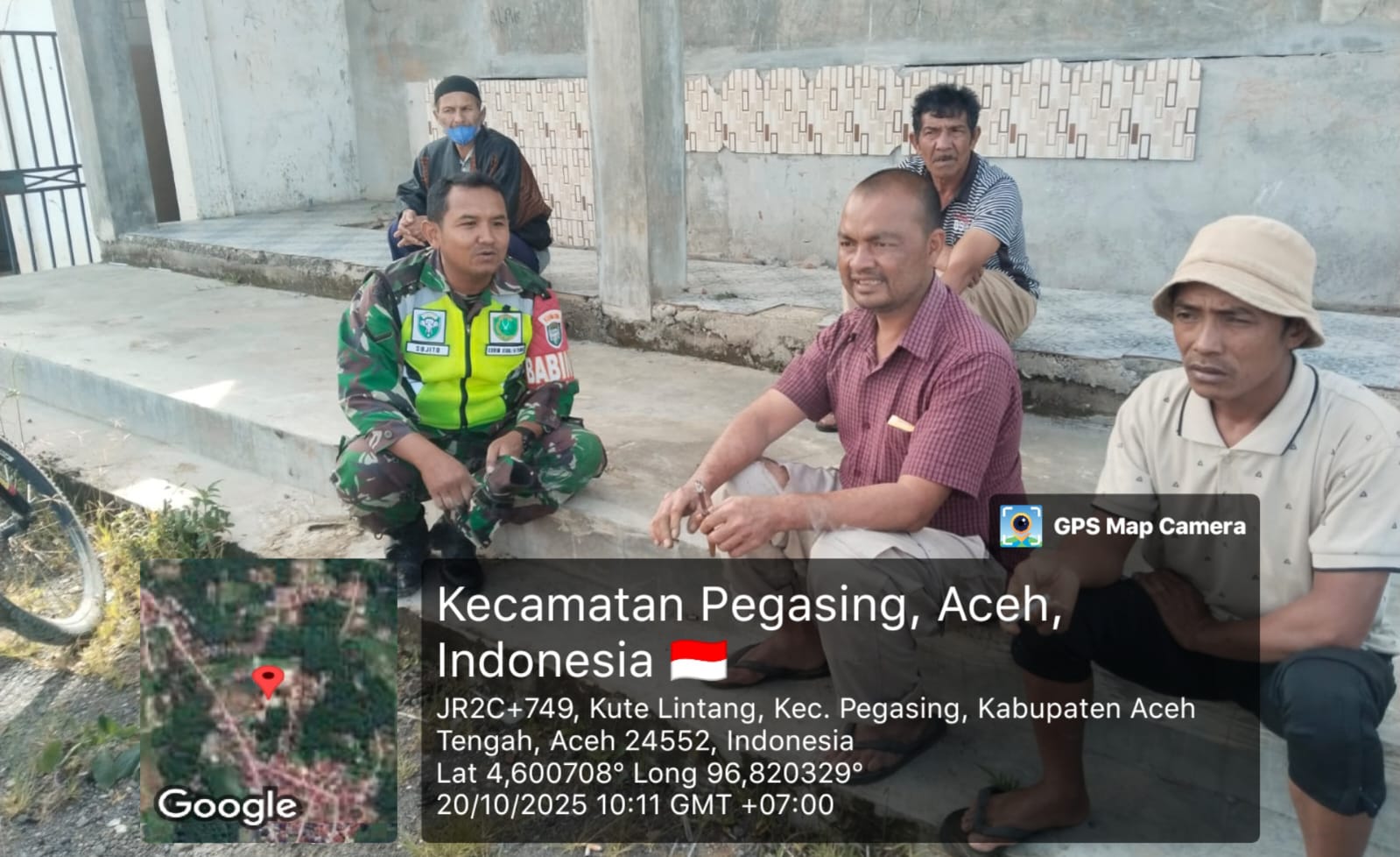 Peran serta Babinsa sangat penting dalam mendukung terwujudnya kemanunggalan TNI dengan rakyat. Hal ini ditunjukkan oleh Babinsa Koramil 03/Pegasing, Serda Sujito, yang melaksanakan kegiatan komunikasi sosial (Komsos) bersama masyarakat di Desa Kute Lintang, Kecamatan Pegasing, Kabupaten Aceh Tengah, Selasa (21/10/2025).