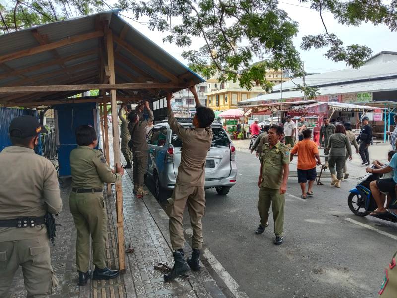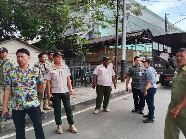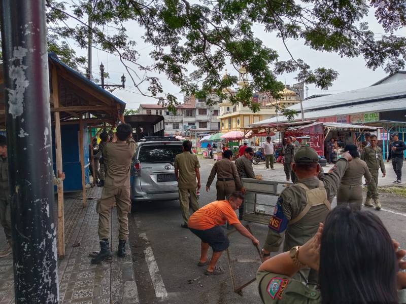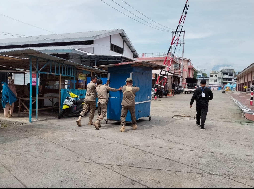 Satuan Polisi Pamong Praja (Satpol PP) Kota Bitung bersama Perumda Pasar melakukan penertiban terhadap sejumlah booth dan lapak pedagang yang berada di atas trotoar dan sebagian di badan jalan, tepatnya di kawasan Pasar Cita dan depan Gedung BCC.