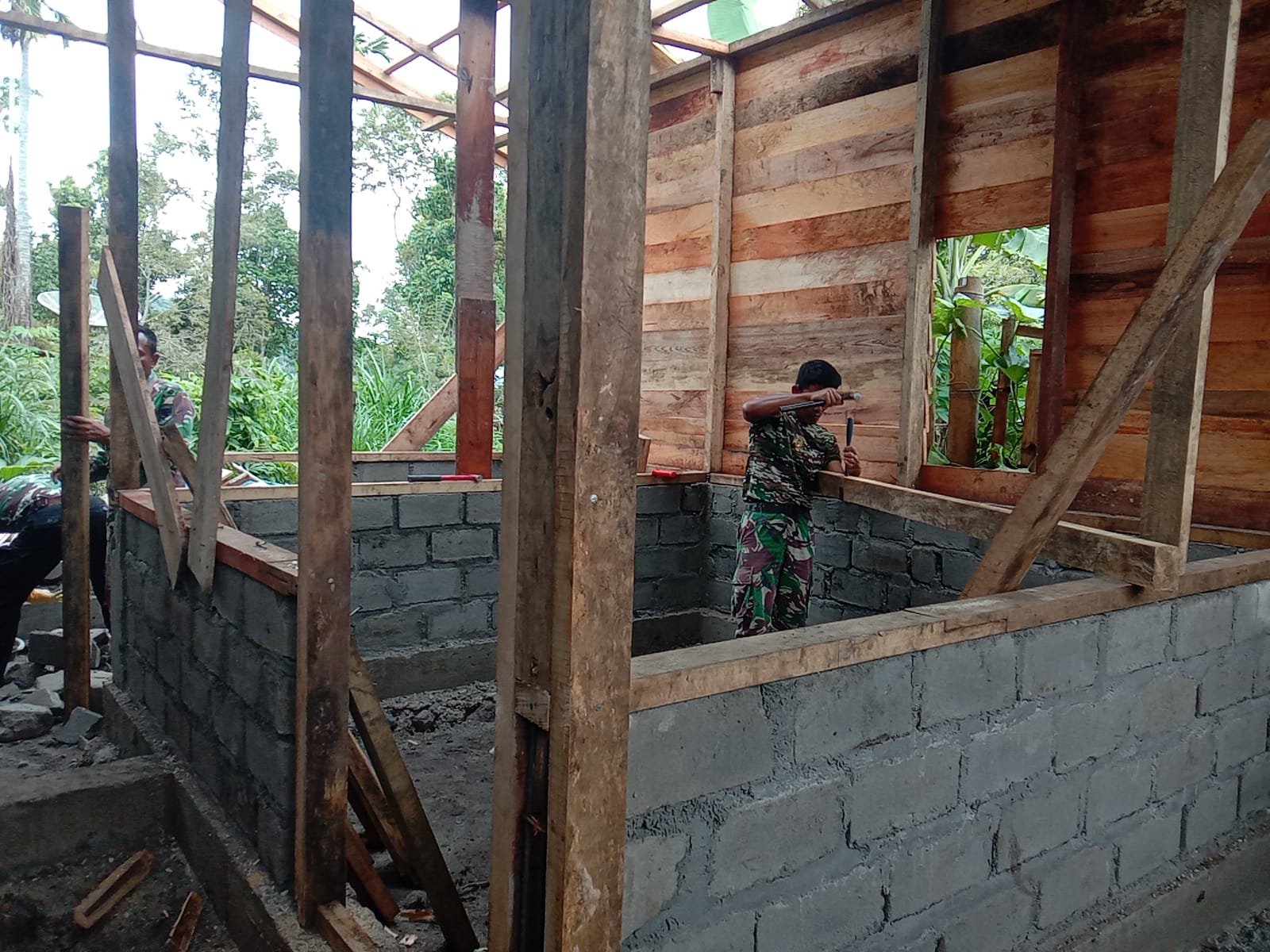 Sejumlah prajurit TNI dari Satgas TMMD terlihat bahu-membahu melanjutkan proses pembangunan, mulai dari pemasangan dinding papan hingga atap rumah. Meskipun cuaca kurang bersahabat akibat musim hujan, para prajurit tetap bekerja dengan penuh semangat dan ketelitian.