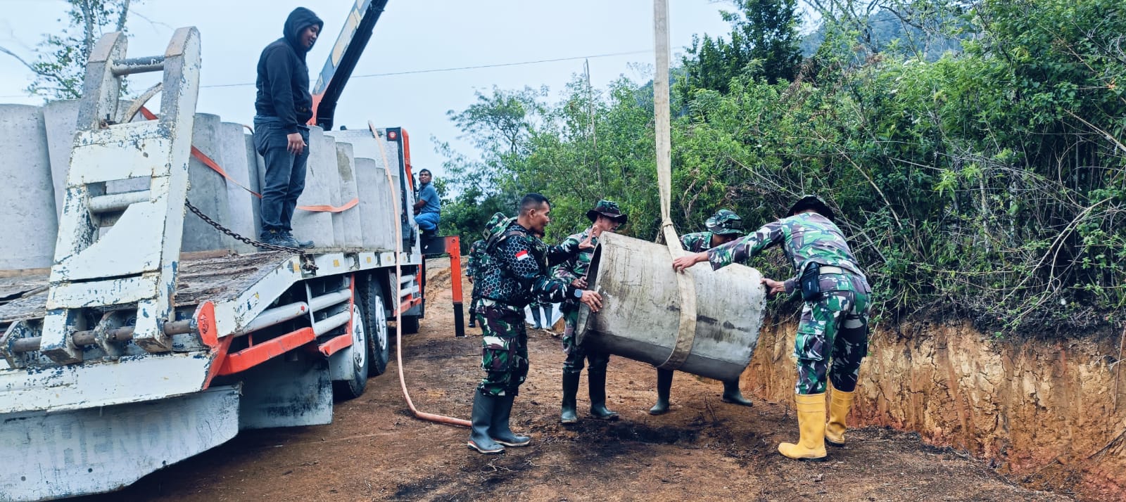 Salah satu Anggota Satgas Serda Anas mengatakan, personel satgas dan masyarakat terlihat kompak bekerja sama menurunkan gorong-gorong yang nantinya akan dipasang guna menghubungkan saluran air sehingga ketika hujan turun tidak menghambat akses jalan.