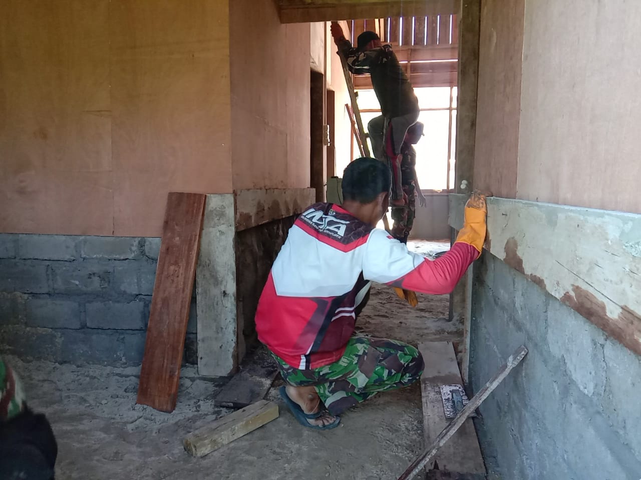 Satgas TMMD terlihat bahu- membahu melaksanakan pembangunan rumah Ibu Kasnawati walaupun dalam suasana di musim hujan ini seorang anggota TNI dengan sigap dan teliti tampak sedang merapikan bangunan nya.