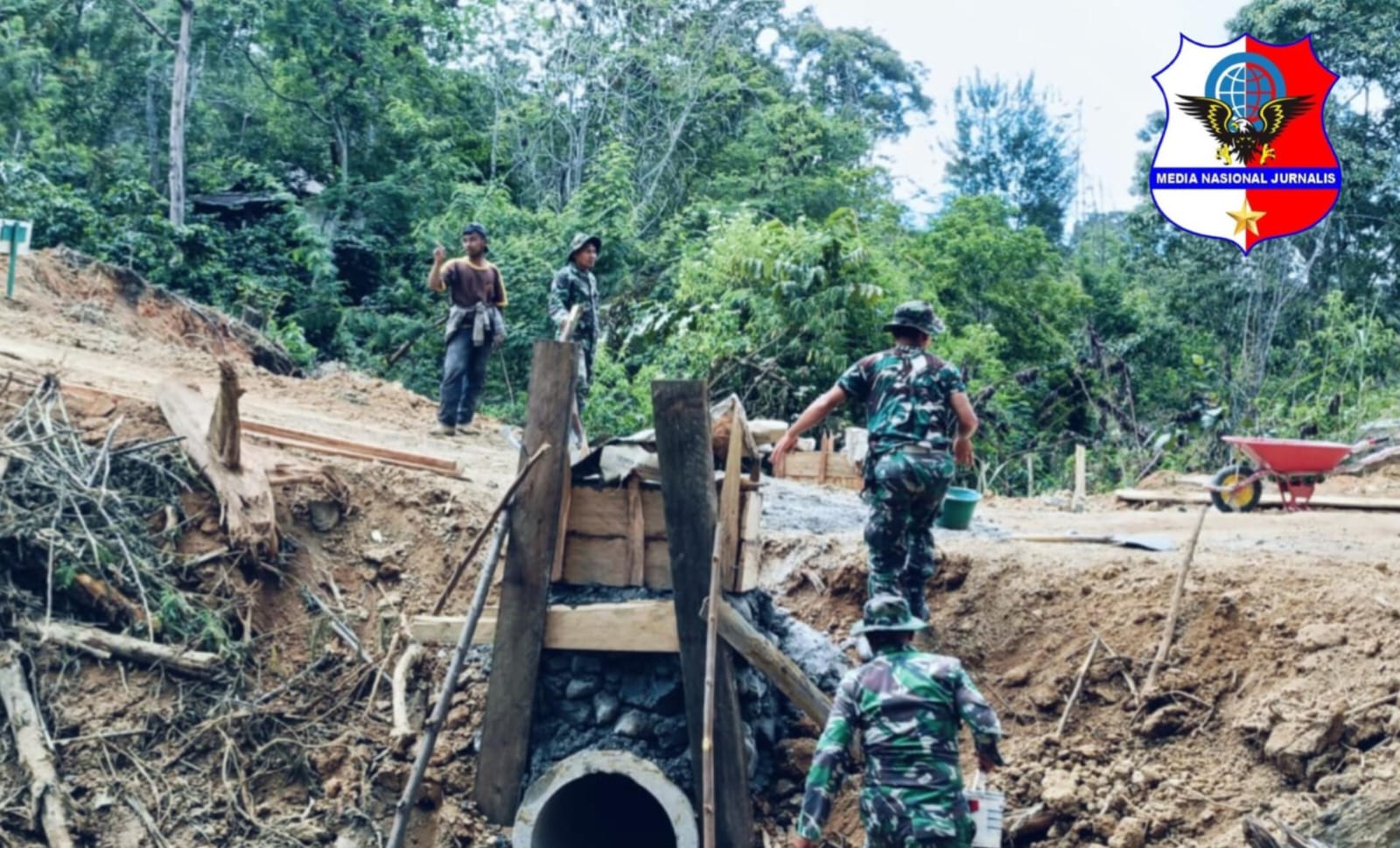 nasionaljurnalis.com, Aceh Tengah – Anggota Satgas TMMD Reguler ke-126 Kodim 0106/Aceh Tengah bersama warga Desa Kute Keramil, Kecamatan Linge, Kabupaten Aceh Tengah, bergotong royong membuat leneng (penahan tanah) di kanan dan kiri bangunan gorong-gorong yang telah selesai dibangun, pada Sabtu (1/10/2025).