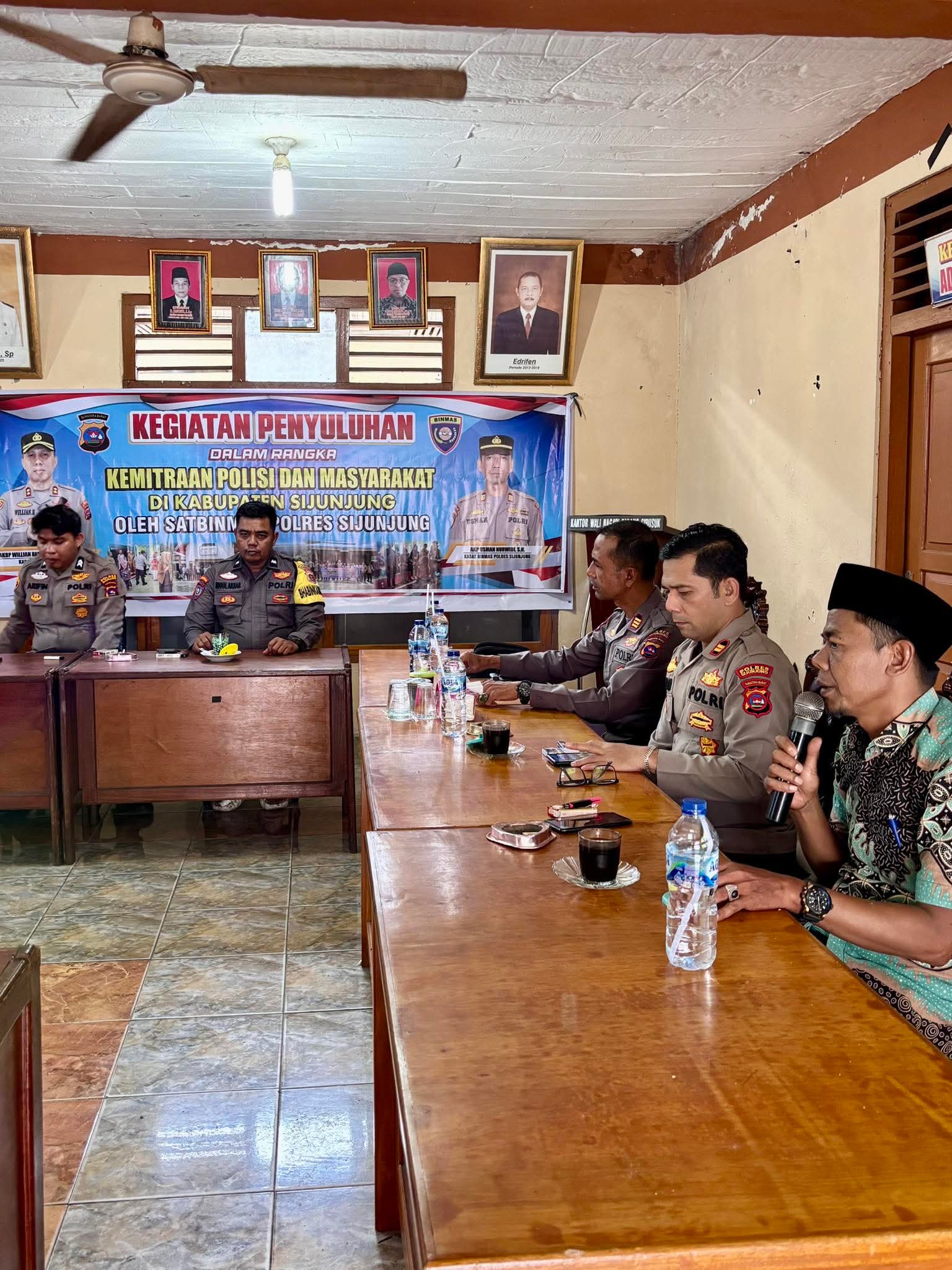 Pada acara Penyuluhan polisi kemitraan dan masyarakat disampaikan oleh Kasat Binmas ( Satbinmas ) Polres Sijunjung mengatakan kegiatan penyuluhan polisi kemitraan dan masyarakat adalah kegiatan yang dilakukan oleh polisi untuk membangun kerja sama erat dengan masyarakat demi menjaga keamanan dan ketertiban (Kamtibmas). Tujuannya adalah untuk mendeteksi, mengidentifikasi, dan memecahkan masalah keamanan bersama-sama melalui komunikasi, kolaborasi, dan edukasi, serta meningkatkan kepercayaan publik terhadap kepolisian.