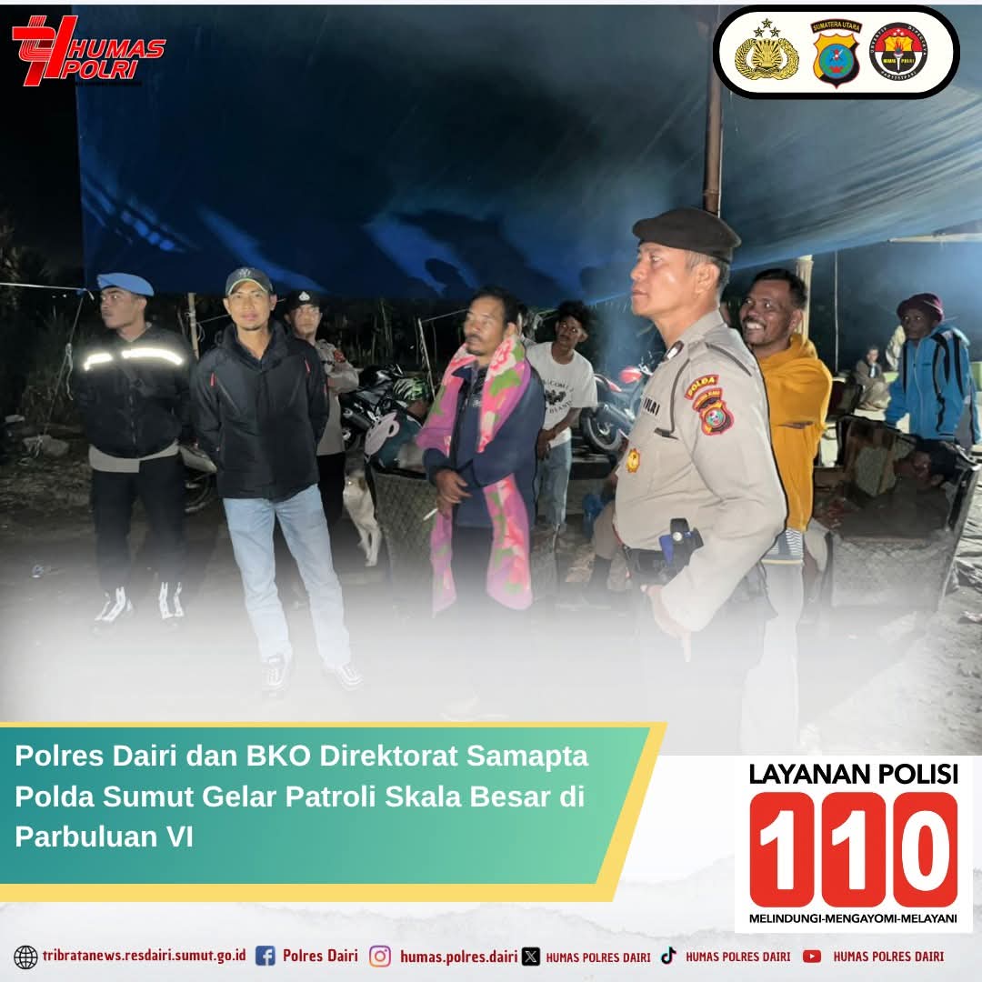 Personel Polres Dairi bersama Personel BKO Direktorat Samapta Polda Sumatera Utara melaksanakan kegiatan pengamanan dan patroli skala besar di Desa Parbuluan VI, Kecamatan Parbuluan, Kabupaten Dairi, pada Jumat malam (14/11/2025).