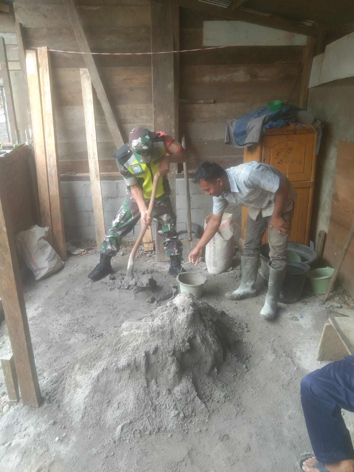 Dalam kegiatan tersebut, Serka Baharudin turut membantu warga mengaduk pasir untuk pemasangan batu bata pada rumah milik Bapak Parianto, salah satu warga desa binaan.