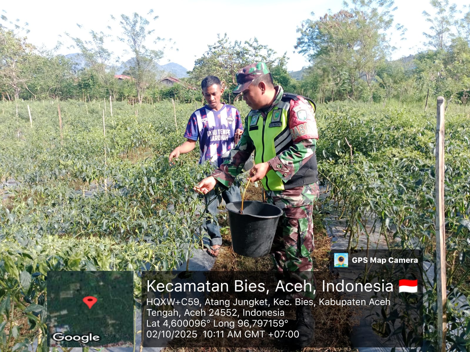 Dalam kegiatan tersebut, Serda Adi R. turut membantu salah satu warga binaannya, Bapak Julkarnaen, yang sedang melaksanakan panen cabai di kebun seluas 2 rante.