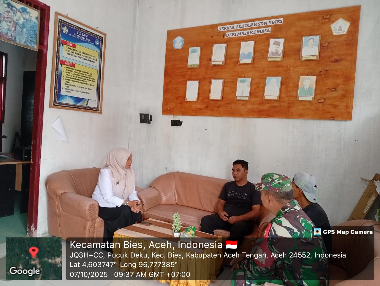 Dalam kegiatan tersebut, Serda Sukarsono bersilaturahmi dengan Kepala Sekolah SDN 6 Bies, Bapak Zulriandi, serta anggota komite sekolah.