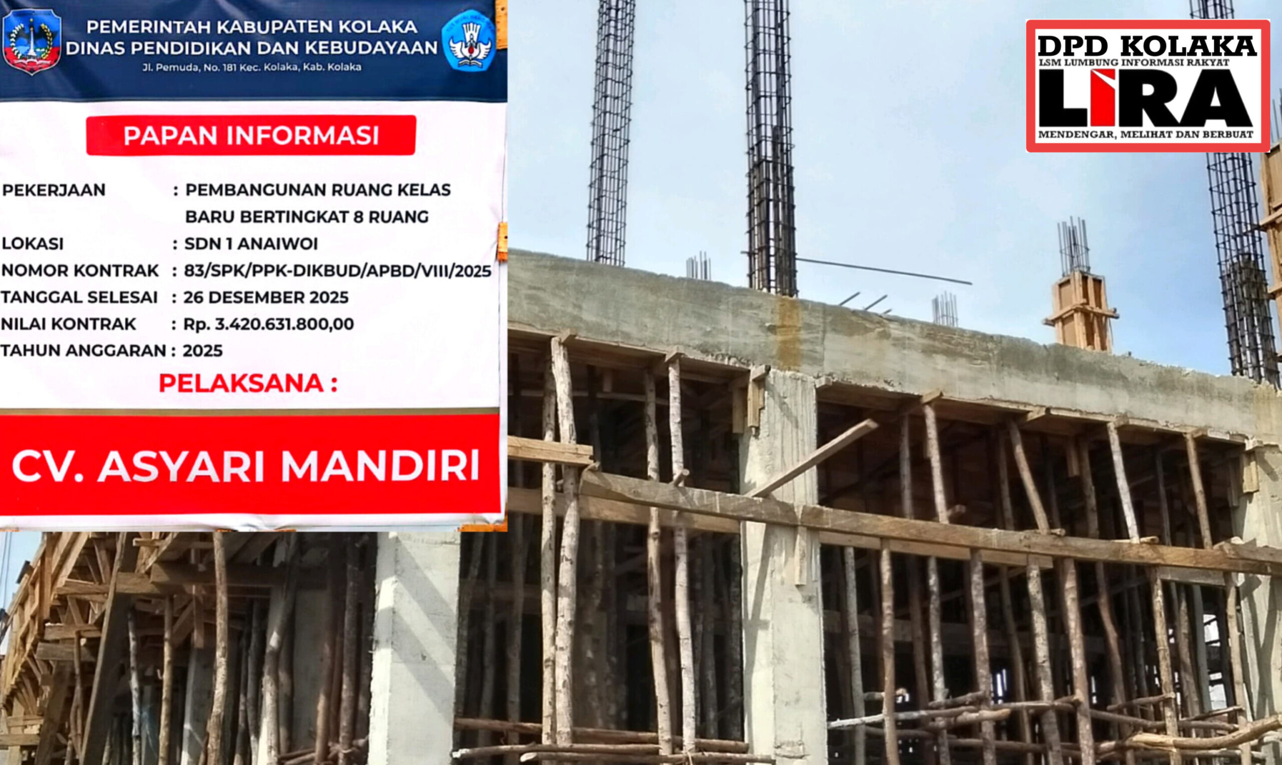 nasionaljurnalis com,Kolaka — DPD LSM LIRA Kolaka kembali menyampaikan sikap resmi terkait perkembangan proyek Pembangunan Ruang Kelas Baru Bertingkat 8 Ruang di SDN 1 Anaiwoi, Kabupaten Kolaka. Proyek yang dikerjakan melalui kontrak Nomor 83/SPK/PPK-DIKBUD/APBD/VIII/2025 dengan nilai Rp 3,420,631,800 dan target penyelesaian 26 Desember 2025, sejak awal memang telah menjadi perhatian serius LIRA Kolaka.