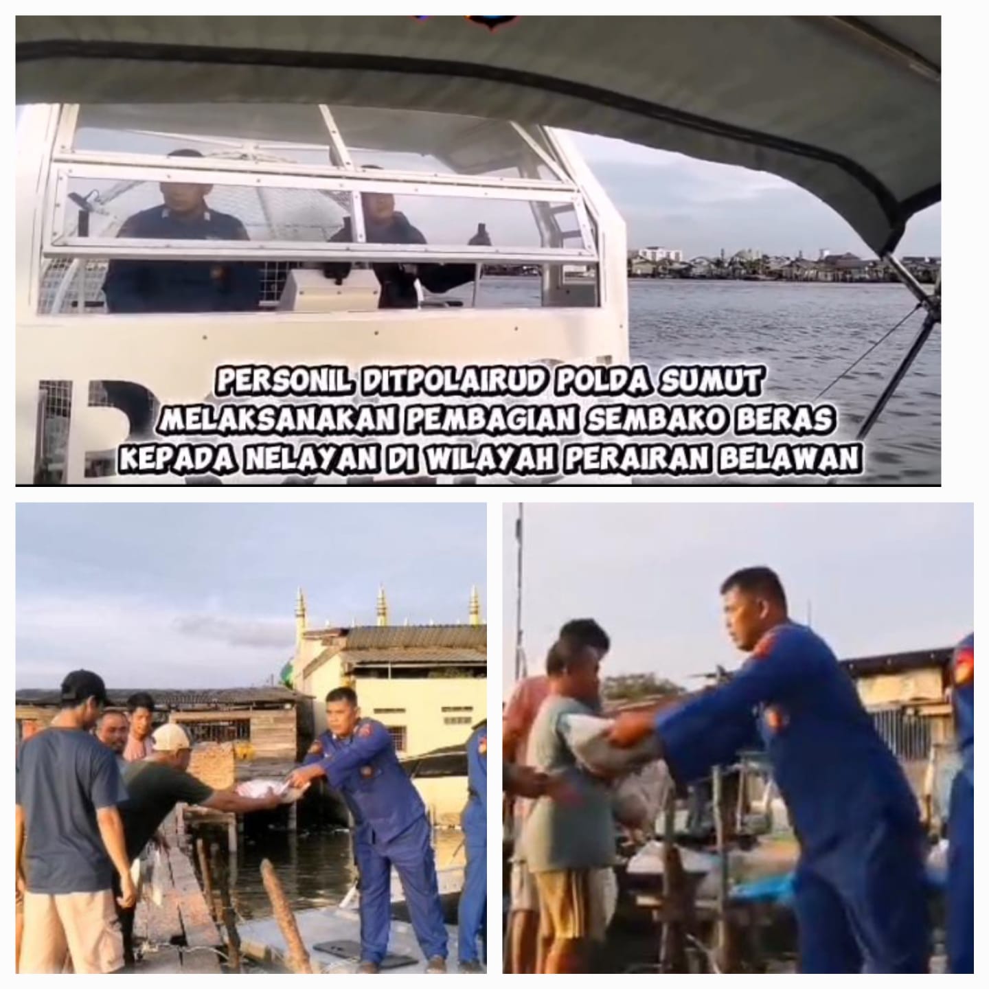 Personel Direktorat Polisi Air dan Udara (Ditpolairud) Polda Sumatera Utara melaksanakan kegiatan sosial berupa pembagian sembako kepada para nelayan di wilayah perairan Belawan, Senin (08/12/2025) sore.