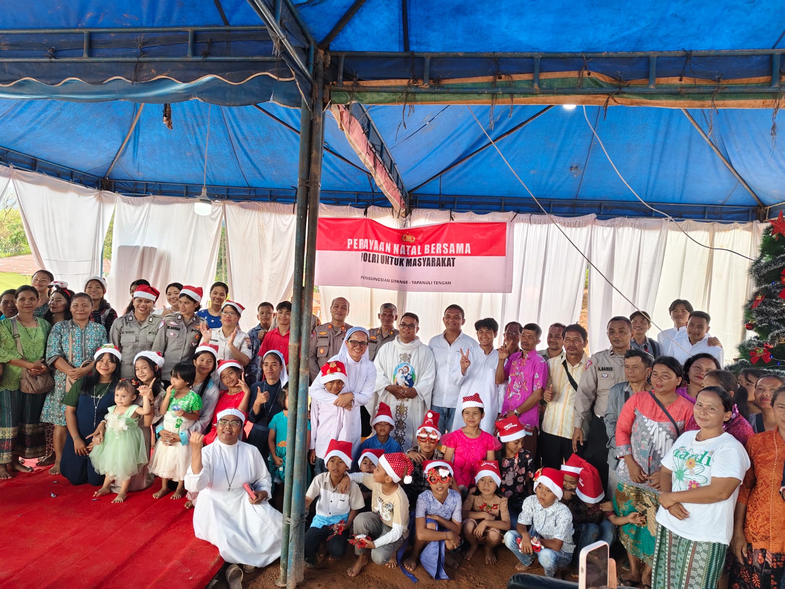 Polres Tapanuli Tengah memfasilitasi Perayaan Natal bersama para pengungsi korban bencana alam di Posko Pengungsian Simpang Sipange, Hutanabolon, Kelurahan Tukka, Kecamatan Tukka, Kabupaten Tapanuli Tengah, Rabu malam (24/12/2025).