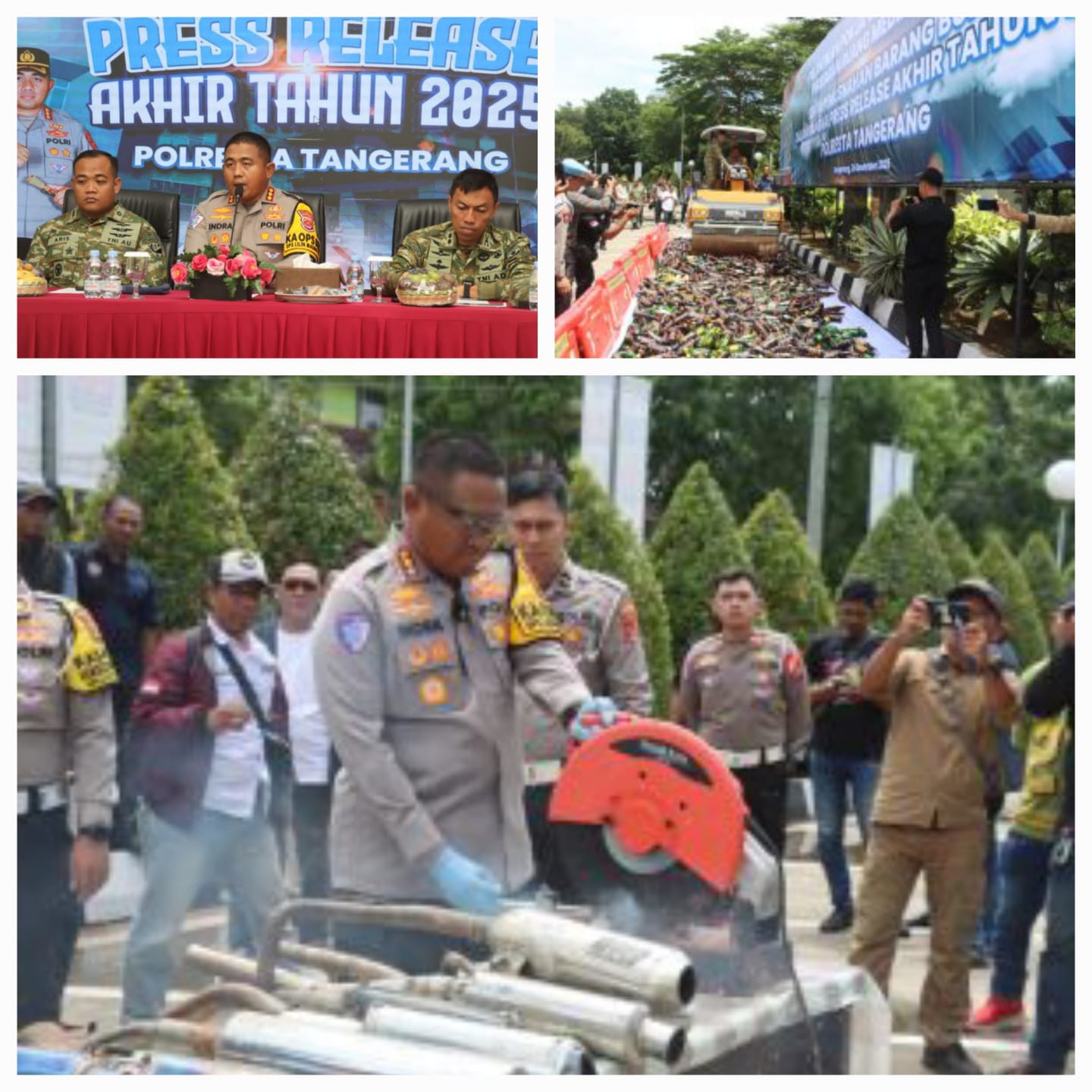 Dalam rangkaian Rilis Akhir Tahun, Polresta Tangerang juga melakukan pemusnahan barang bukti berupa 135 dus berisi 1.860 botol minuman keras, 70 bilah senjata tajam, serta 27 knalpot brong hasil Operasi Patuh.