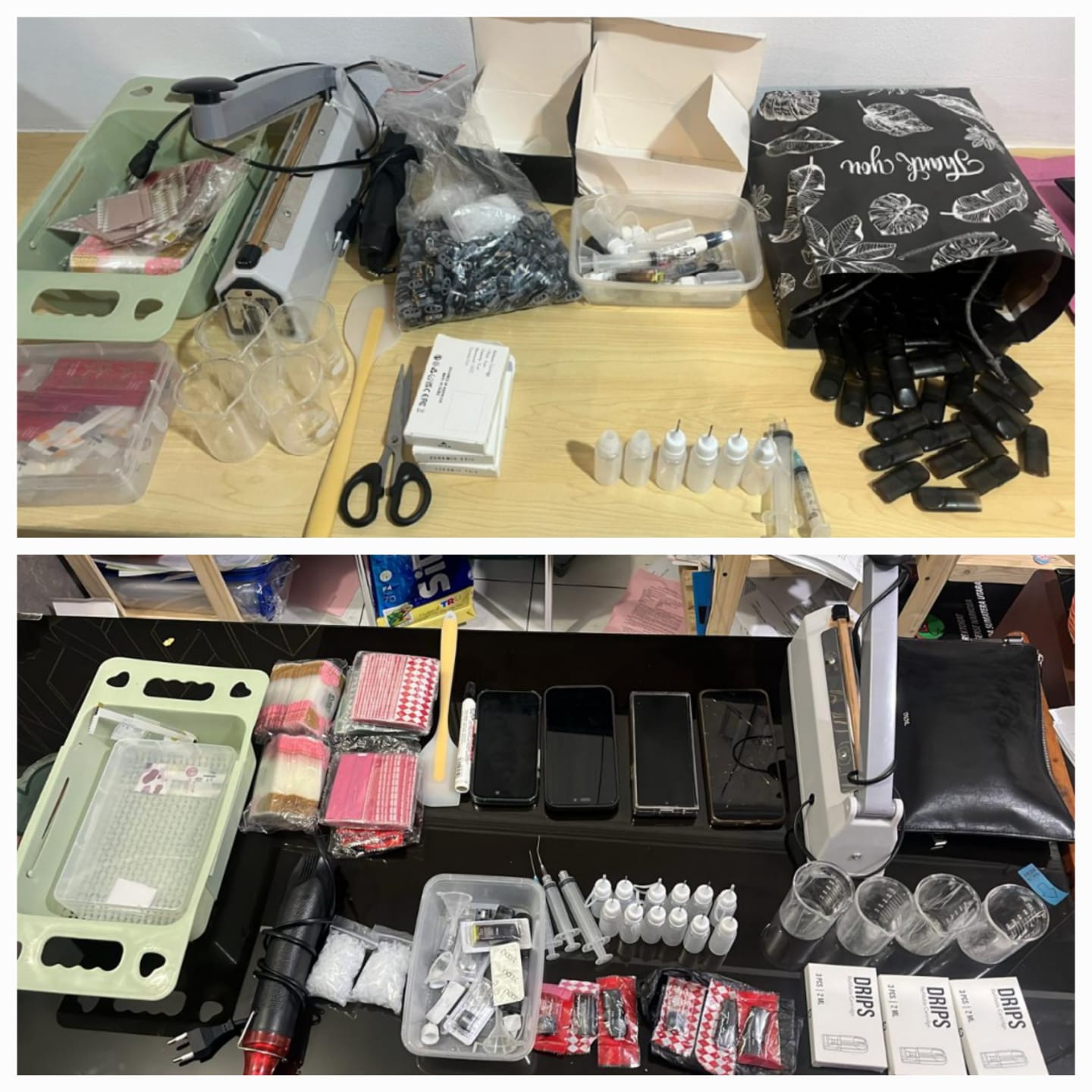 Dalam rangkaian pengungkapan ini, seorang perempuan berinisial C.A. (26) turut diamankan guna kepentingan penyelidikan lebih lanjut. Adapun barang bukti yang disita meliputi ratusan cartridge dan penutupnya, botol plastik, alat ukur, suntikan, mesin pres, alat pemanas, telepon genggam, dua unit kendaraan roda empat, serta berbagai perlengkapan pendukung lainnya.