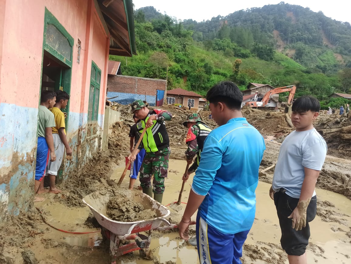 Babinsa Desa Tebuk Koramil 03/Pegasing Kodim 0106/Aceh Tengah Serda Puspida bersama personel Koramil dan masyarakat melaksanakan kegiatan karya bakti pasca tanah longsor dan banjir bandang di Desa Tebuk, Kecamatan Pegasing, Kabupaten Aceh Tengah, Minggu (11/01/2026).