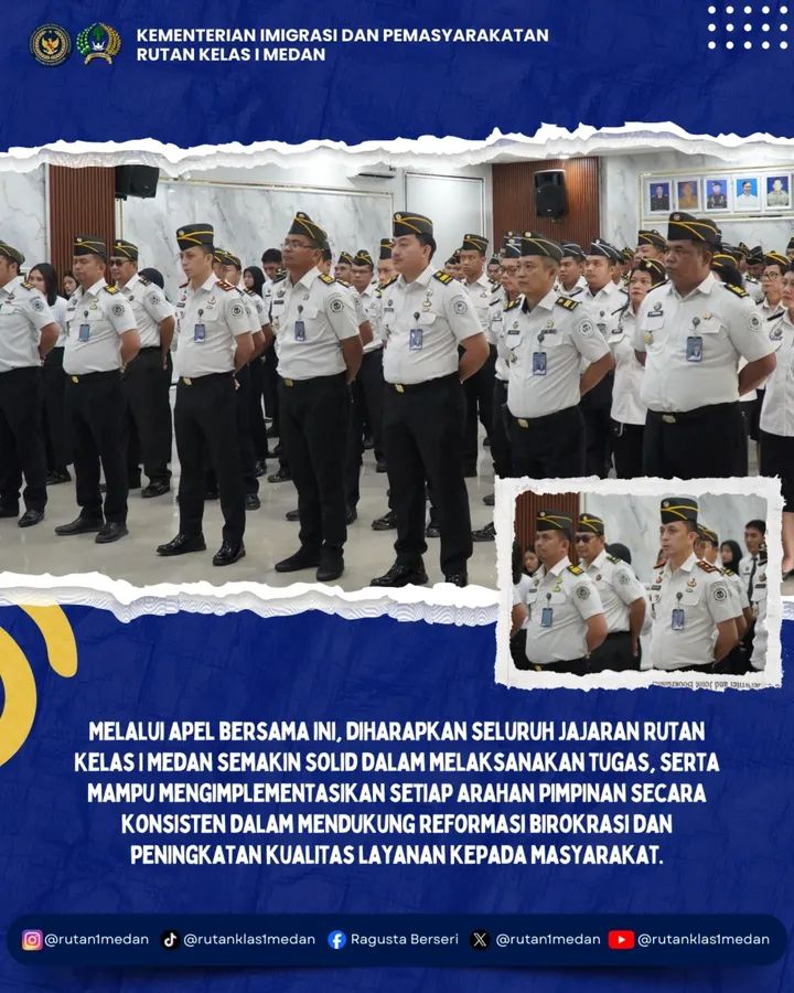 Melalui apel bersama ini, diharapkan seluruh jajaran Rutan Kelas I Medan semakin solid dalam melaksanakan tugas, serta mampu mengimplementasikan setiap arahan pimpinan secara konsisten dalam mendukung reformasi birokrasi dan peningkatan kualitas layanan kepada masyarakat.