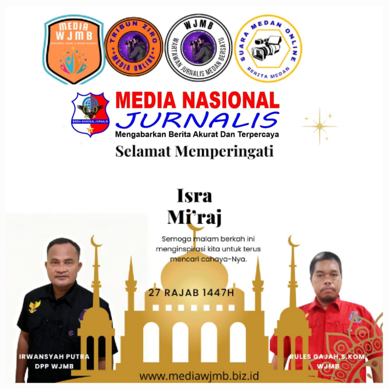 Jumat, 16 Januari 2026,Ketua Umum Dewan Pimpinan Pusat Wartawan Jurnalis Medan Bersatu (DPP WJMB), Irwansyah Putra, bersama seluruh jajaran pengurus DPP WJMB, mitra media, pimpinan redaksi, serta staf media yang tergabung dalam jaringan Media WJMB, memperingati Isra’ Mi’raj Nabi Muhammad SAW 27 Rajab 1447 Hijriah, di Kota Medan, Jumat (16/01/2026).