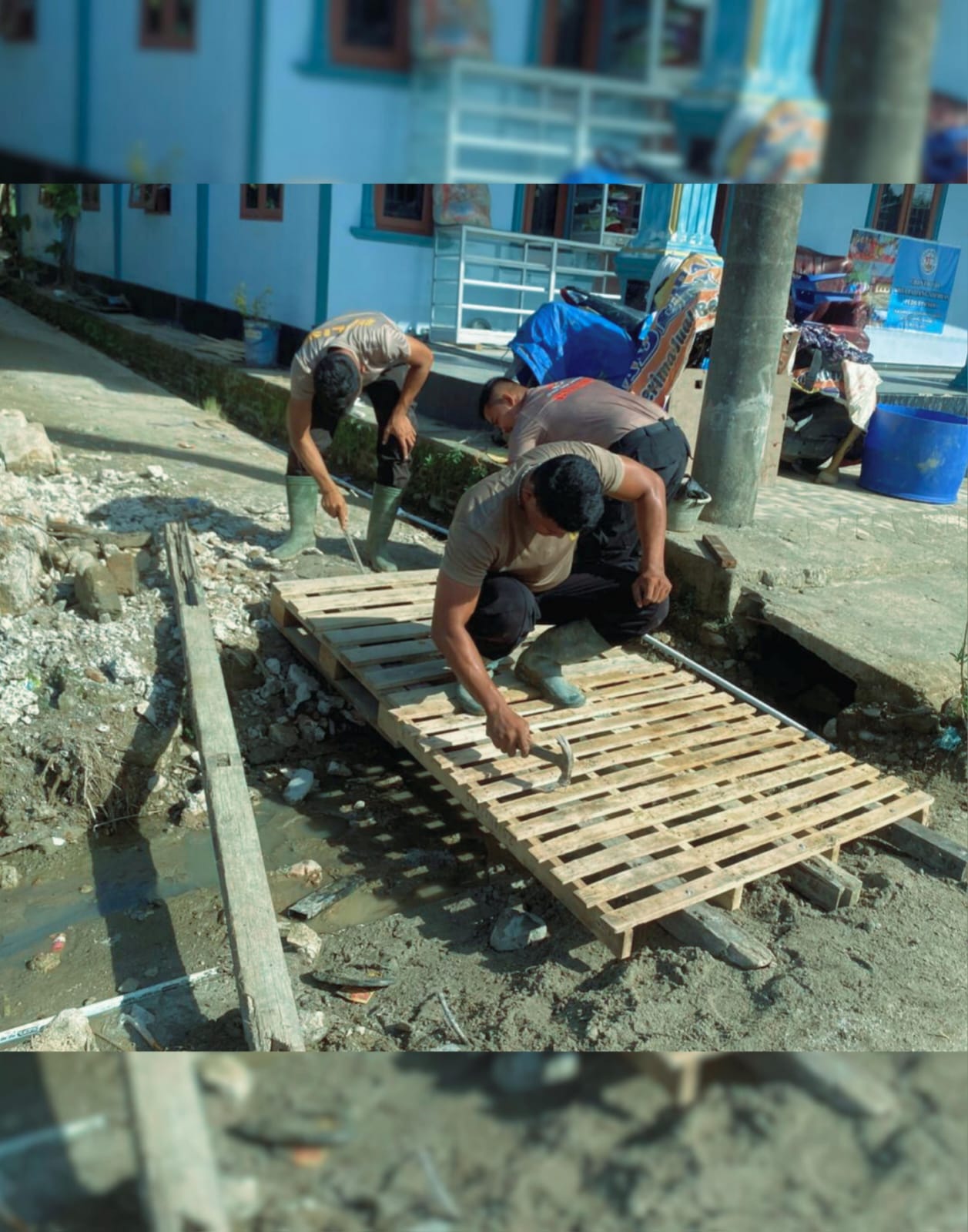 Bersama Personel Brimob bekerja secara bertahap dengan menggunakan peralatan manual dan mesin, mulai dari cangkul, sekop, beko sorong, mesin penyedot air, hingga chainsaw, guna memastikan proses pembersihan dan pembangunan berjalan efektif dan aman.