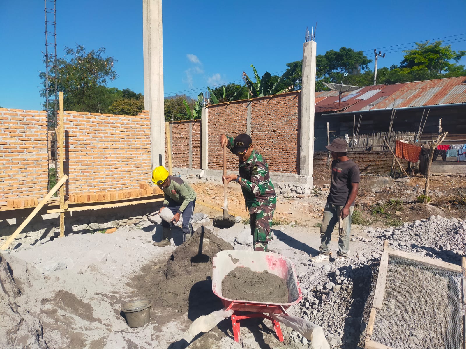 Babinsa Serda Didi Kurniadi turut membantu masyarakat desa binaan dalam kegiatan pembangunan rumah milik Bapak Amlir yang berlokasi di Desa SP Kelaping, Kecamatan Pegasing, Kabupaten Aceh Tengah, Senin (26/01/2026).