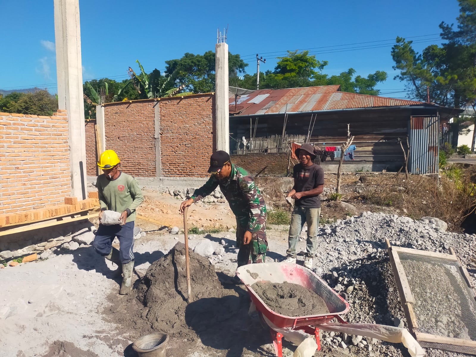 Babinsa Serda Didi Kurniadi turut membantu masyarakat desa binaan dalam kegiatan pembangunan rumah milik Bapak Amlir yang berlokasi di Desa SP Kelaping, Kecamatan Pegasing, Kabupaten Aceh Tengah, Senin (26/01/2026).
