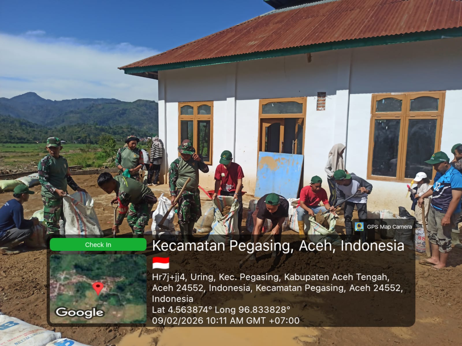 Anggota Satuan Tugas Penanggulangan Bencana Alam (Satgas Gulbencal) Kodim 0106/Aceh Tengah melaksanakan kegiatan pembuatan tanggul penahan air di Menasah Makbul Makfirah, Desa Tebuk, Kecamatan Pegasing, Kabupaten Aceh Tengah, Senin (9/2/2026).