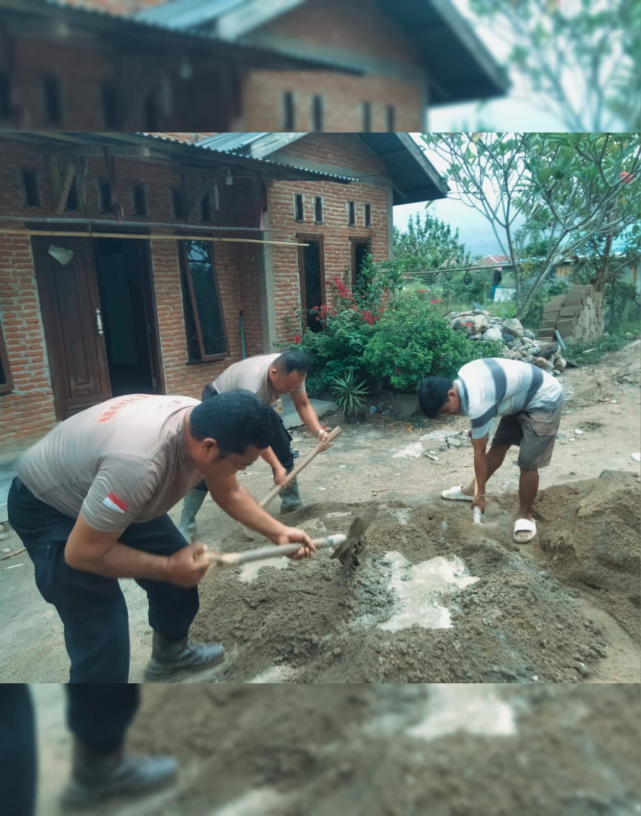 Di tengah kondisi cuaca mendung, kegiatan pembangunan tetap berjalan dengan semangat kebersamaan. Personel Brimob bergotong royong bersama warga memasang besi pondasi, melangsir material batu, serta merakit besi dan menimbun tanah sebagai bagian dari pembangunan rumah hunian sementara dan hunian tetap bagi warga terdampak banjir.