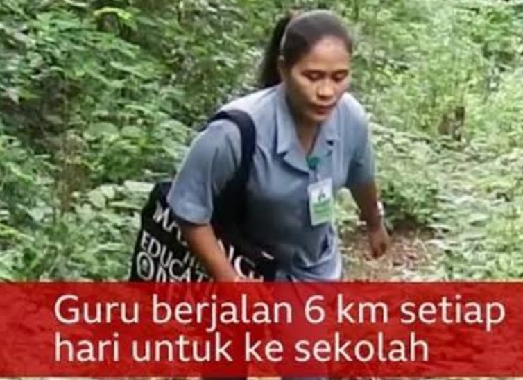 Vinsensia Ervina Talluma, seorang guru honorer di Kabupaten Sikka, NTT, harus berjalan kaki sejauh enam kilometer setiap kali mengajar. Dengan gaji hanya Rp 300.000 perbulan