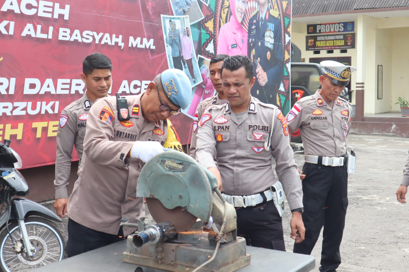 Kegiatan press release ditutup dengan pemusnahan 17 knalpot tidak sesuai spesifikasi (knalpot brong) hasil penindakan selama Operasi Keselamatan Seulawah 2026.