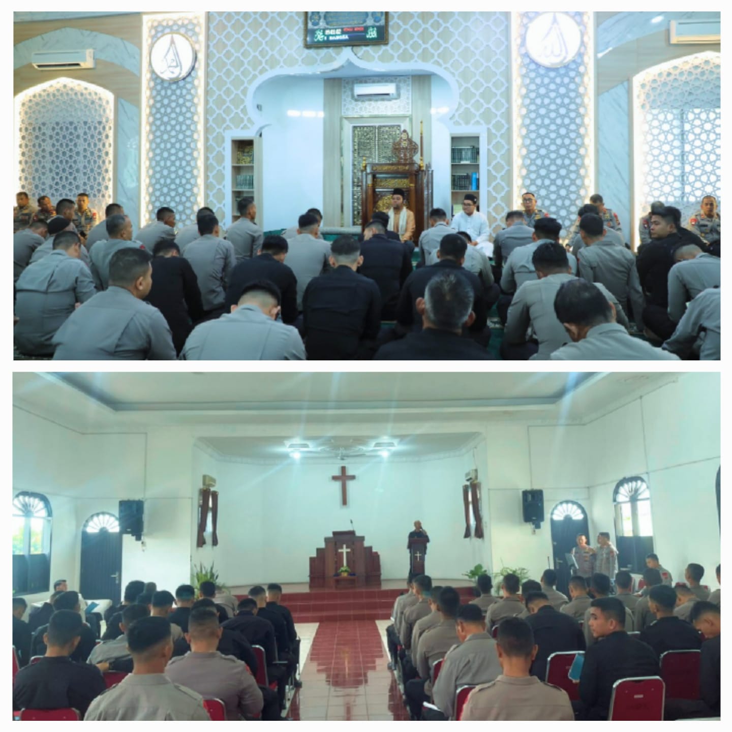 Kegiatan yang berlangsung penuh khidmat ini digelar di Masjid Al-Barokah dan Gereja Oikumene Sat Brimob Polda Sumut, sebagai wujud komitmen pembinaan spiritual bagi seluruh personel sesuai dengan keyakinan masing-masing.