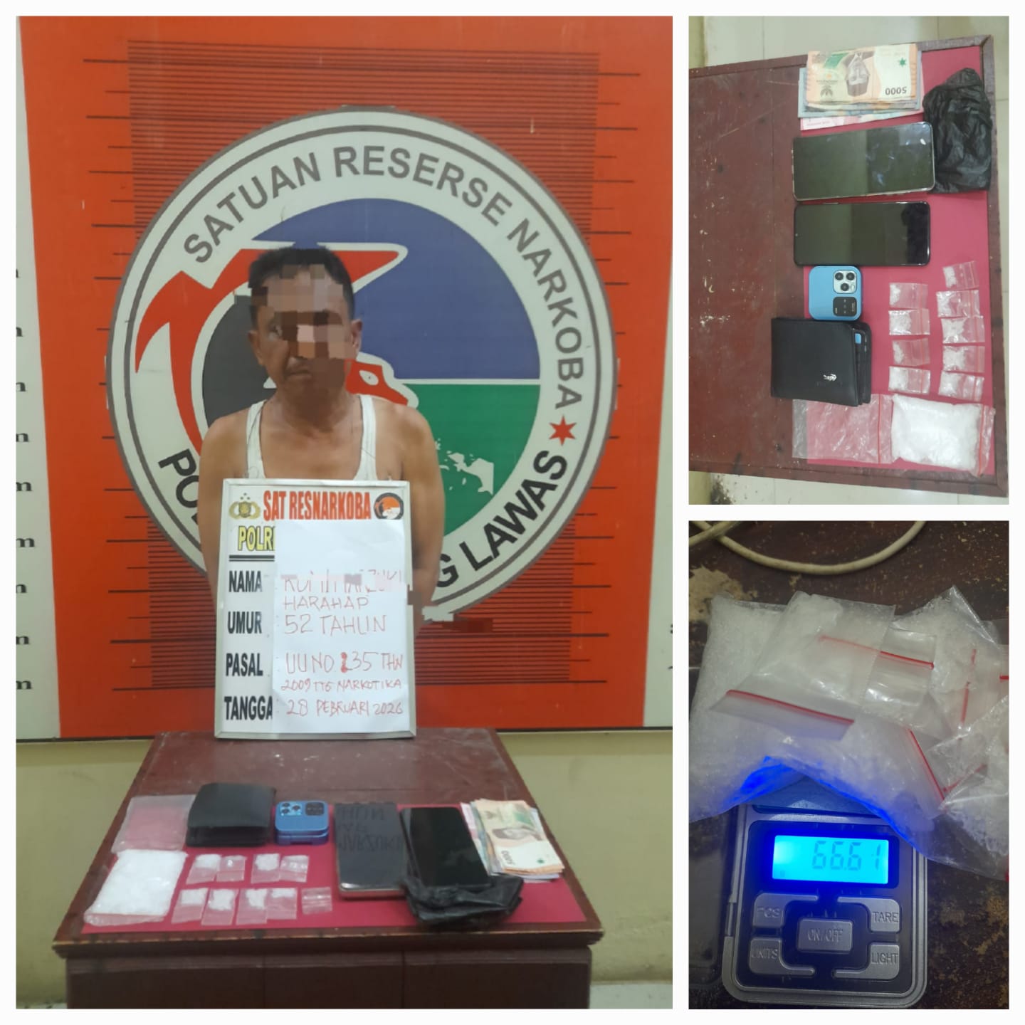 Tim Opsnal Satuan Reserse Narkoba Kepolisian Resor Padang Lawas (Satresnarkoba Polres Palas) kembali menangkap seorang pengedar narkotika jenis sabu Berinisial MRH, (52), warga desa Pancaukan, Kecamatan Barumun, Kabupaten Palas, di salah satu rumah yang berlokasi di Wek I, Pasar Sibuhuan, Kecamatan Barumun, Kabupaten Palas. Sabtu. (28/02/2026), Pukul 03.30 wib hingga selesai.