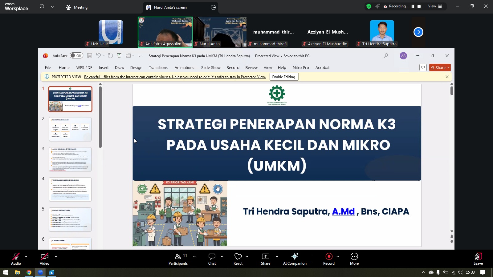 Webinar ini dilaksanakan pada Minggu, 08 Maret 2026, pukul 15.00–16.30 WIB secara daring (live session online). Kegiatan menghadirkan Tri Hendra Saputra, A. Md Bns., CIAPA, praktisi auditor dan K3, sebagai narasumber yang membahas strategi penerapan keselamatan dan kesehatan kerja secara sederhana namun efektif di lingkungan usaha kecil.
