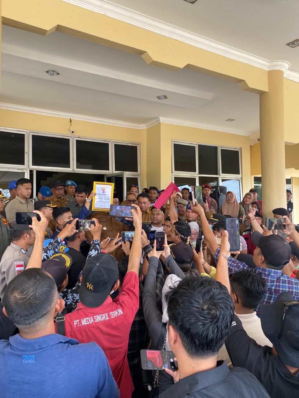 “Aksi unjuk rasa berlangsung di halaman Kantor Bupati Aceh Singkil dengan pengawalan aparat keamanan dari kepolisian dan unsur terkait. Selama berlangsungnya aksi, situasi terpantau berjalan dengan tertib dan kondusif hingga massa membubarkan diri.