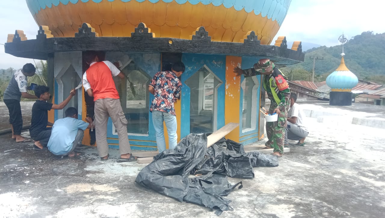 Selain membersihkan area sekitar masjid, Babinsa bersama warga juga melakukan pengecatan pada bagian kubah masjid agar terlihat lebih rapi dan indah.